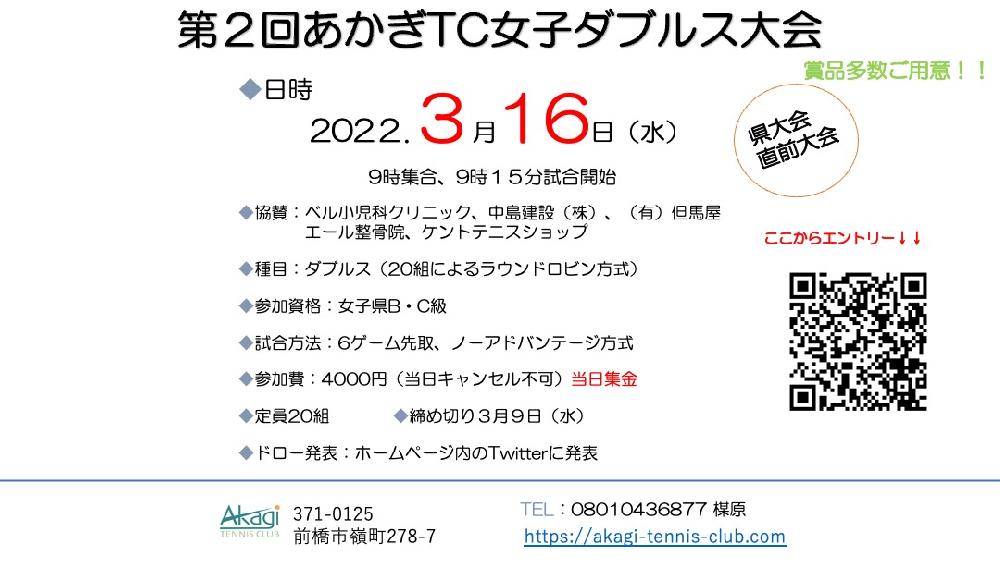 県大会直前大会あかぎTC女子ダブルス大会協賛のおかげで賞品も多数ご用意致します。大満足間違いなしの大会です。たくさんのお申し込みお待ちしてます。