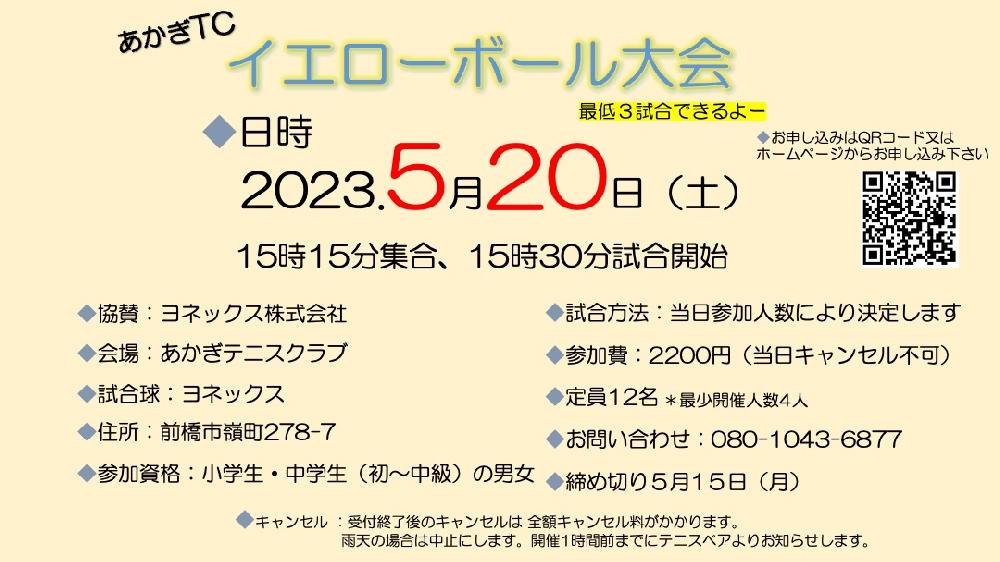2023年5月20日(土)イエローボール大会5月2023年5月21日(日)アフタヌーンサーキット第3戦最低3試合できます。たくさん試合したい方にはもってこいの大会です。ご参加お待ちしてます。お申し込みはQRコード又は下記URLよりお申し込み下さい。https://www.tennisbear.net/tournament/prefecture/pref10