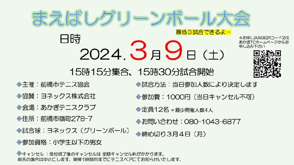 まえばしグリーンボール大会3月最低3試合できます!!3月9日(土)15時30分から会場:あかぎテニスクラブ お申し込みはQRコードまたは下記URLよりhttps://www.tennisbear.net/event/prefecture/pref10